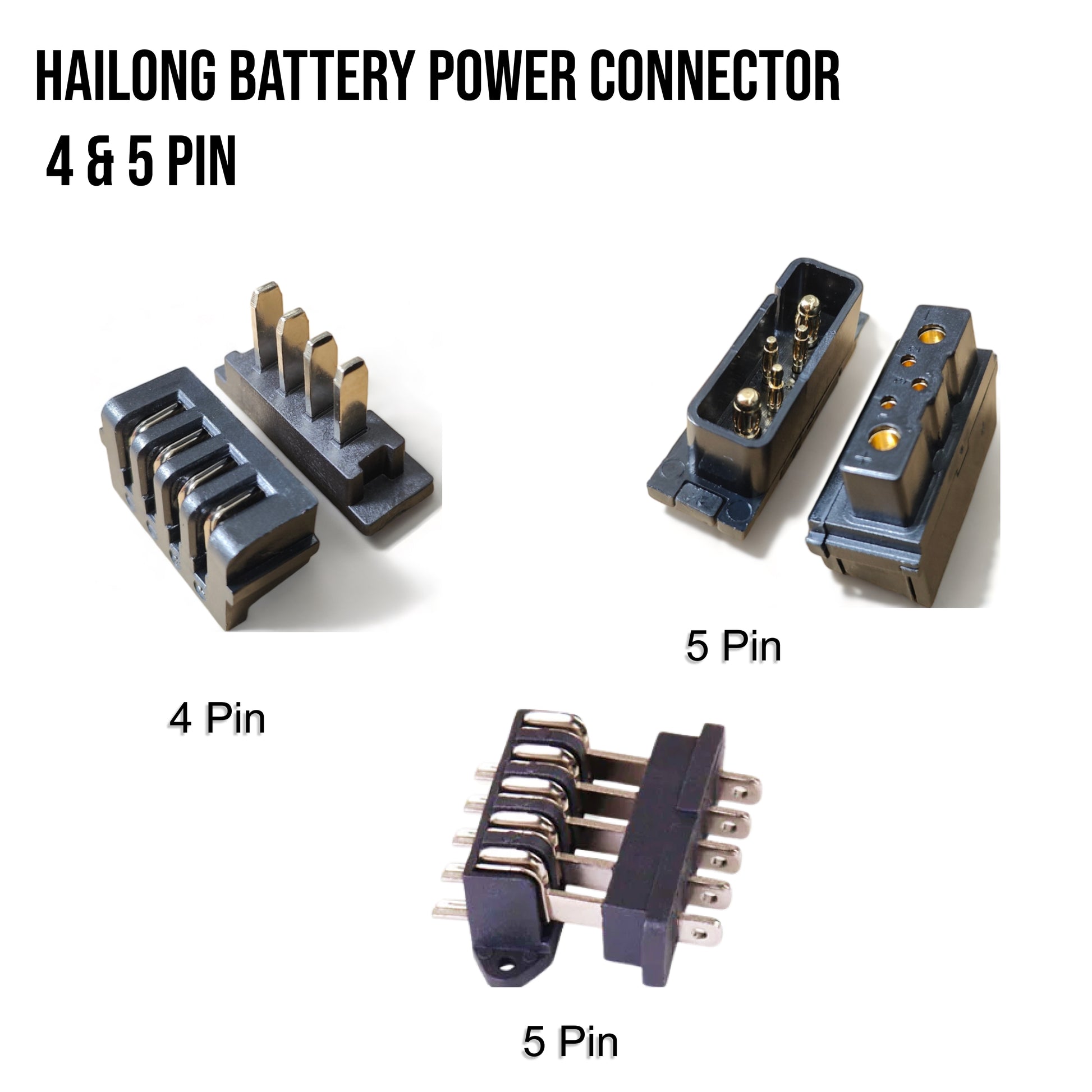 - Hailong Battery Power Discharge Connector Plug: Designed for use in the UK, available in 4 Pins and 5 Pins with both Male and Female connectors.